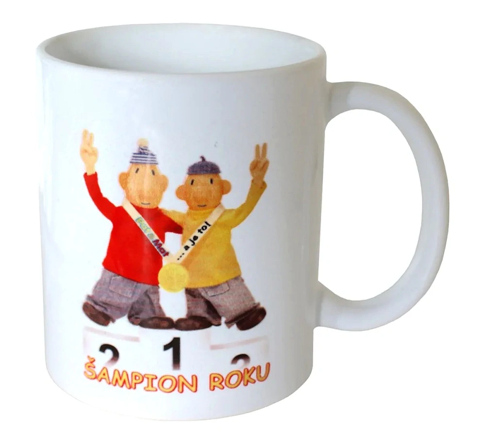 Hrnek klasického tvaru s oblíbenými postavičkami Pat a Mat pro všechny sportovce nebo šampiony v jakékoliv disciplíně.