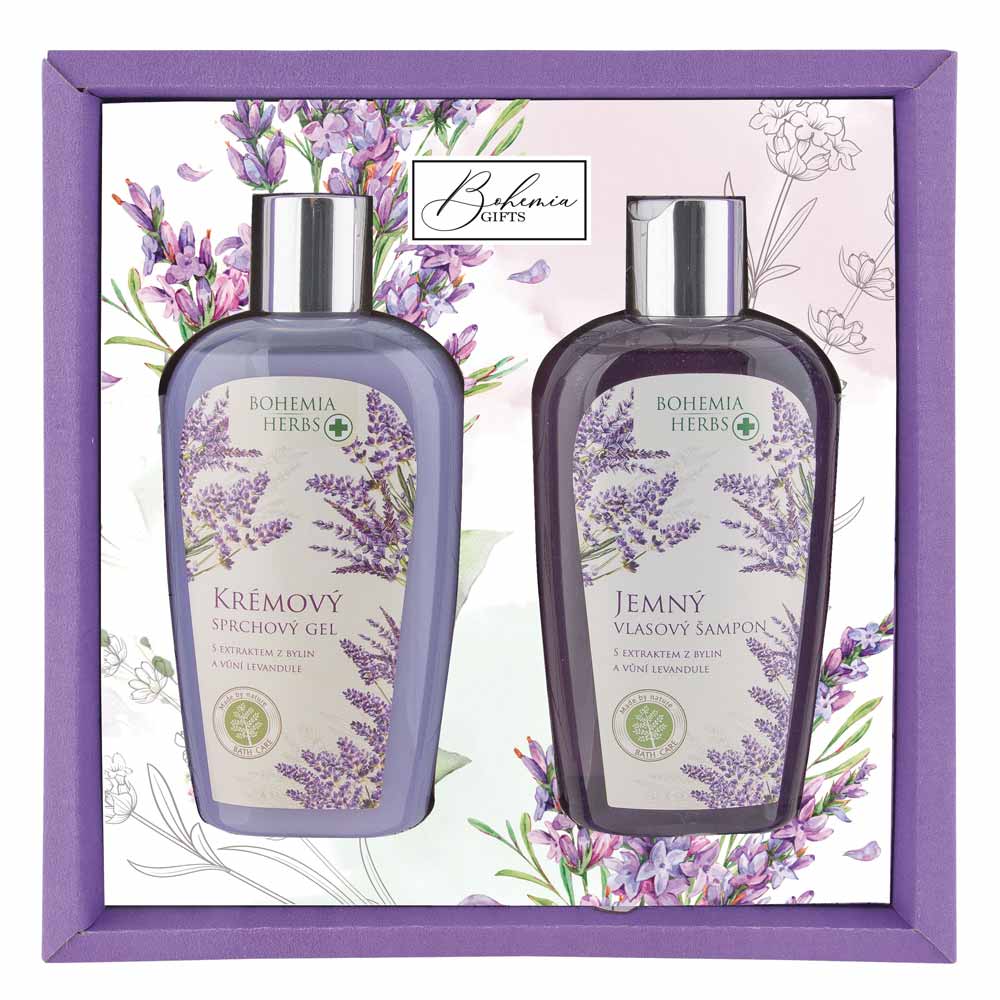Dárkové balení levandulové kosmetiky - krémový sprchový gel 250 ml a vlasový šampon 250 ml s extraktem z bylin a vůní levandule. Krásný voňavý dárek pro ženu elegantně zabalený v dárkovém balení. Vyrobeno v České republice.