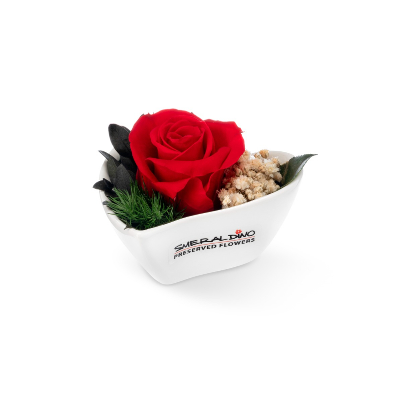 Aranž je umístěna v bílém keramickém květináčku ve tvaru srdce a dodávána v elegantním dárkovém balení, takže je připravena k okamžitému předání. Díky svým kompaktním rozměrům se skvěle hodí na pracovní stůl, polici, noční stolek nebo jako decentní dekorace do interiéru.