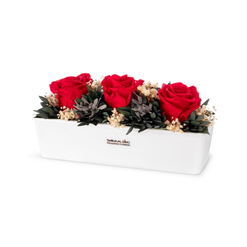 Aranž je umístěna v bílém keramickém truhlíčku a dodávána v elegantním dárkovém balení, takže je připravena k okamžitému předání. Díky svým kompaktním rozměrům se skvěle hodí na pracovní stůl, polici, noční stolek nebo jako luxusní dekorace do interiéru.