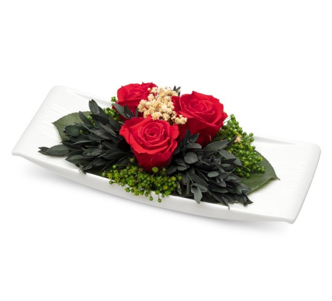 Aranž je umístěna na bílé podlouhlé, lehce prohnuté keramické misce a dodávána v průhledném dárkovém balení, takže je připravena k okamžitému předání. Díky svým kompaktním rozměrům se skvěle hodí na pracovní stůl, polici, noční stolek nebo jako decentní dekorace do interiéru.