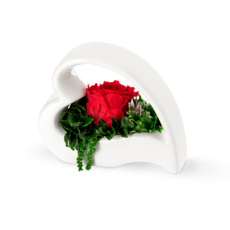 Aranž je umístěna v bílém stojícím keramickém srdci a dodávána v průhledném dárkovém balení, takže je připravena k okamžitému předání. Díky svým kompaktním rozměrům se skvěle hodí na pracovní stůl, polici, noční stolek nebo jako decentní dekorace do interiéru.