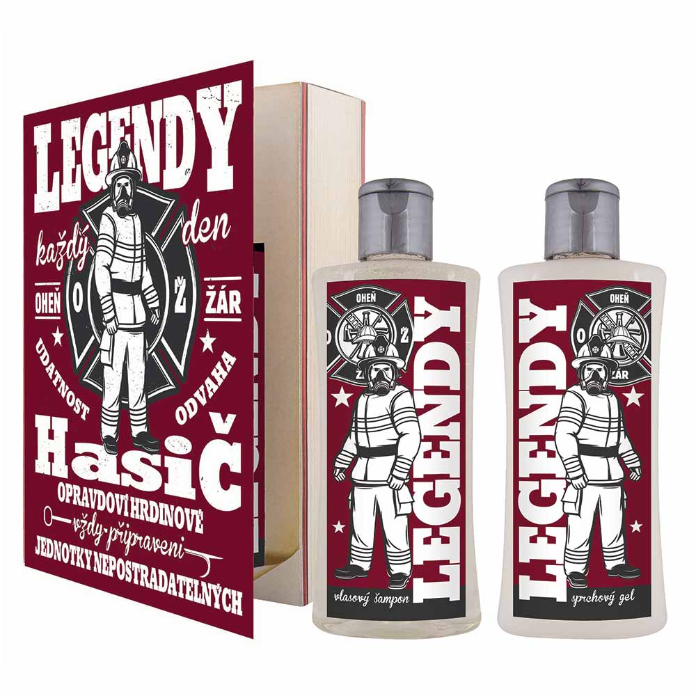 Dárkové balení kosmetiky – pro hasiče. Kosmetický dárkový balíček – sprchový gel 250 ml a vlasový šampon 250 ml s olivovým olejem – v netradičním balení – kniha pro hasiče. Po odklopení přední strany krabičky si můžete přečíst několik krátkých hasičských vtipů.