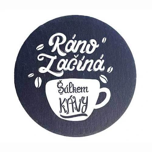Kulatý kameninový podtácek pod hrníček o průměru 10 cm s nápisem Ráno začíná šálkem kávy. Břidlicová podložka pod hrnek, která ochrání váš stůl před zašpiněním a poškrábáním.