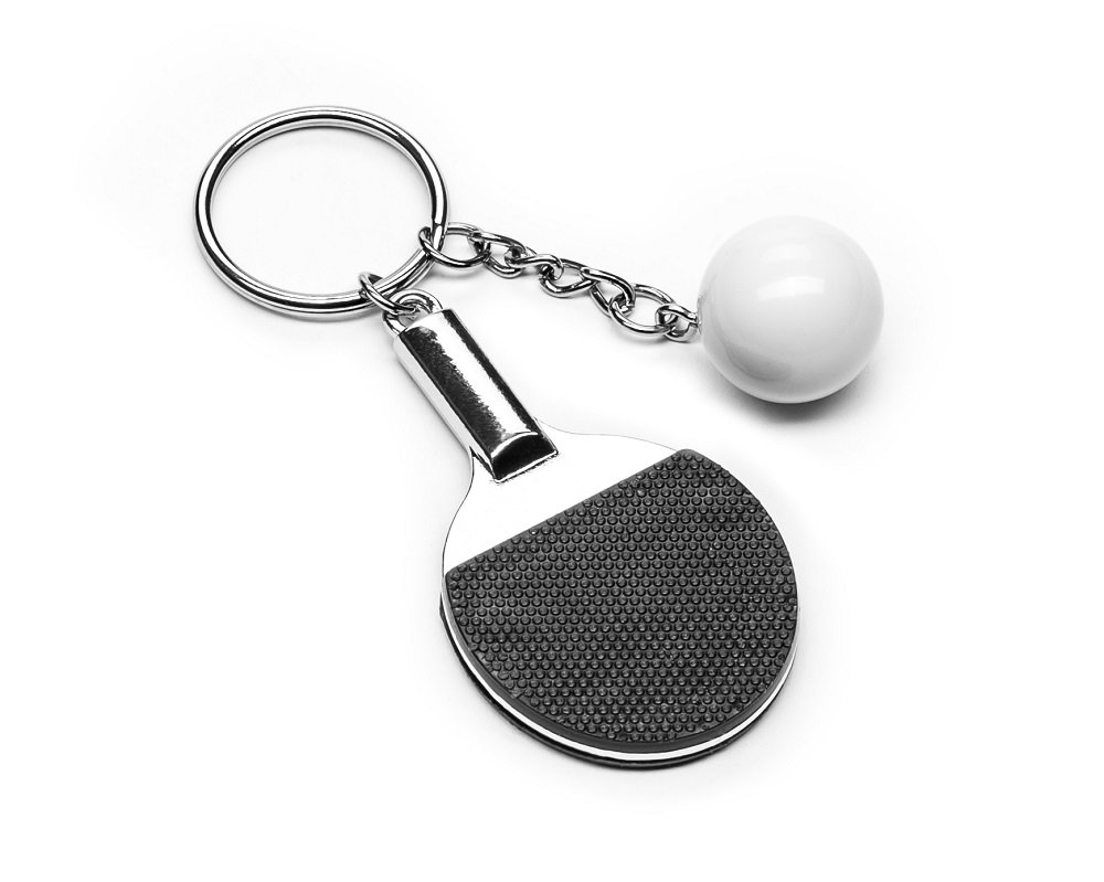 Kovová klíčenka s přívěskem ve tvaru pálky na stolní tenis a míčku.