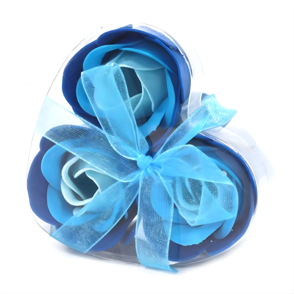 Mýdlové květy růže v krabičce srdce 3ks - modrá