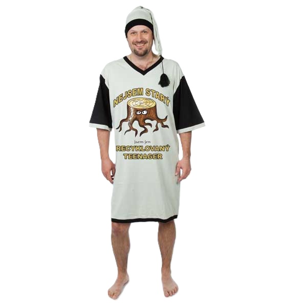 Tato pánská noční košile z čisté bavlny je ideální pro muže, kteří si umí udělat legraci ze svého věku. Vtipný nápis „Nejsem starý, jsem jen recyklovaný teenager“ v kombinaci s obrázkem dodává košili originální a hravý vzhled.