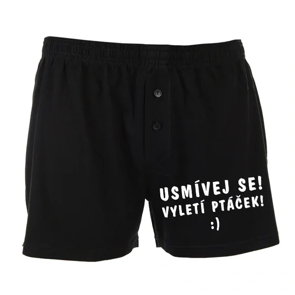 Vtipné pánské trenky s nápisem „Usmívej se! Vyletí ptáček :o)“, které pobaví a odlehčí každou situaci. Pohodlný střih a ideální dárek pro muže s nadhledem. celý popis