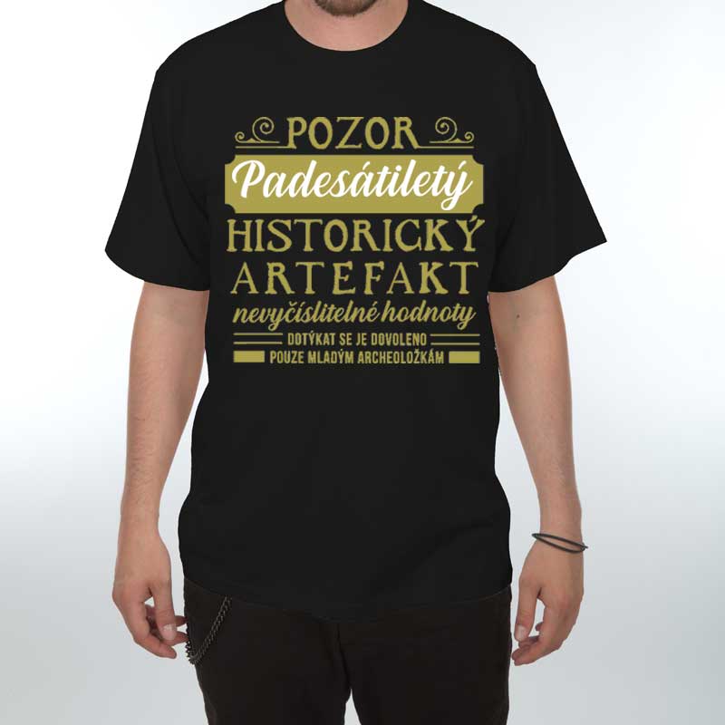 Narozeninové tričko s číslem 50 a vtipným potiskem "Pozor padesátiletý historický artefakt nevyčíslitelné hodnoty". Pro všechny oslavence mladé duchem. Zábavný potisk dělá z trička originální a osobní dárek, který potěší oslavence i pobaví okolí. Hodí se na narozeninovou oslavu, párty i běžné nošení po celý rok.